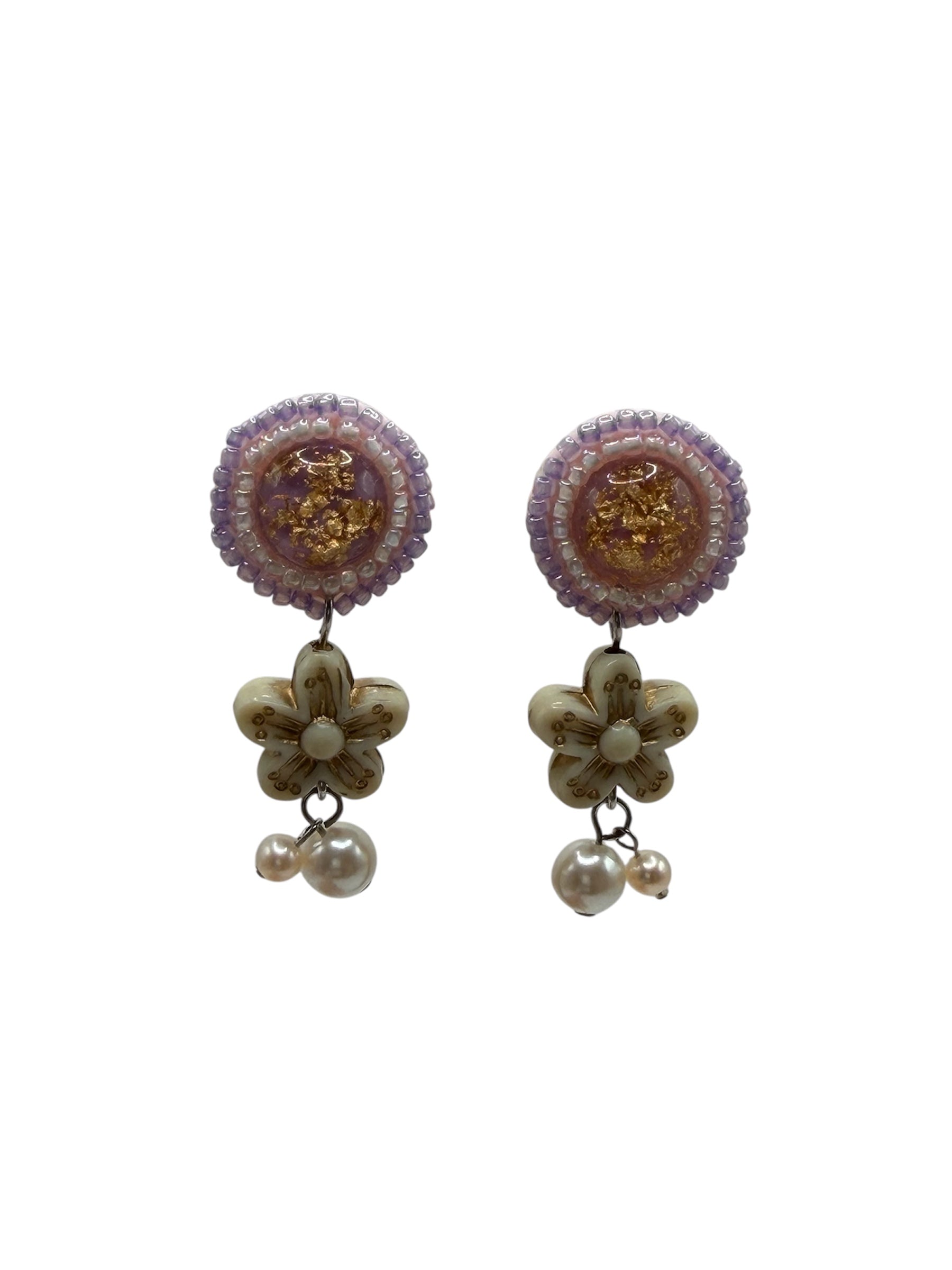 These handmade Japanese earrings bring together delicate texture, soft color, and whimsical charm in a composition that feels both artistic and refined. The round top features a lavender-toned beaded border framing a luminous center with gold leaf-style detail, creating a rich sense of depth in a compact silhouette.