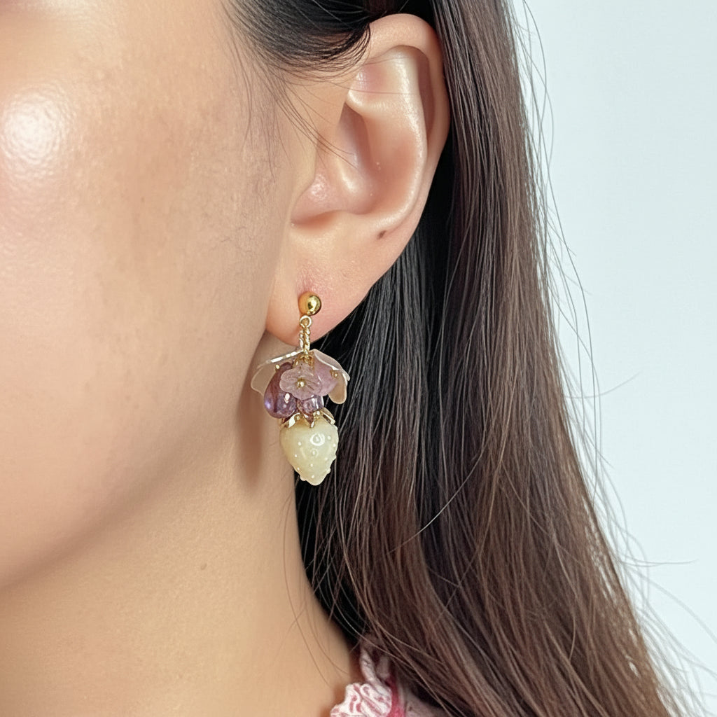 - Handmade fruit inspired earrings with Japanese strawberry beads in a soft milky purple